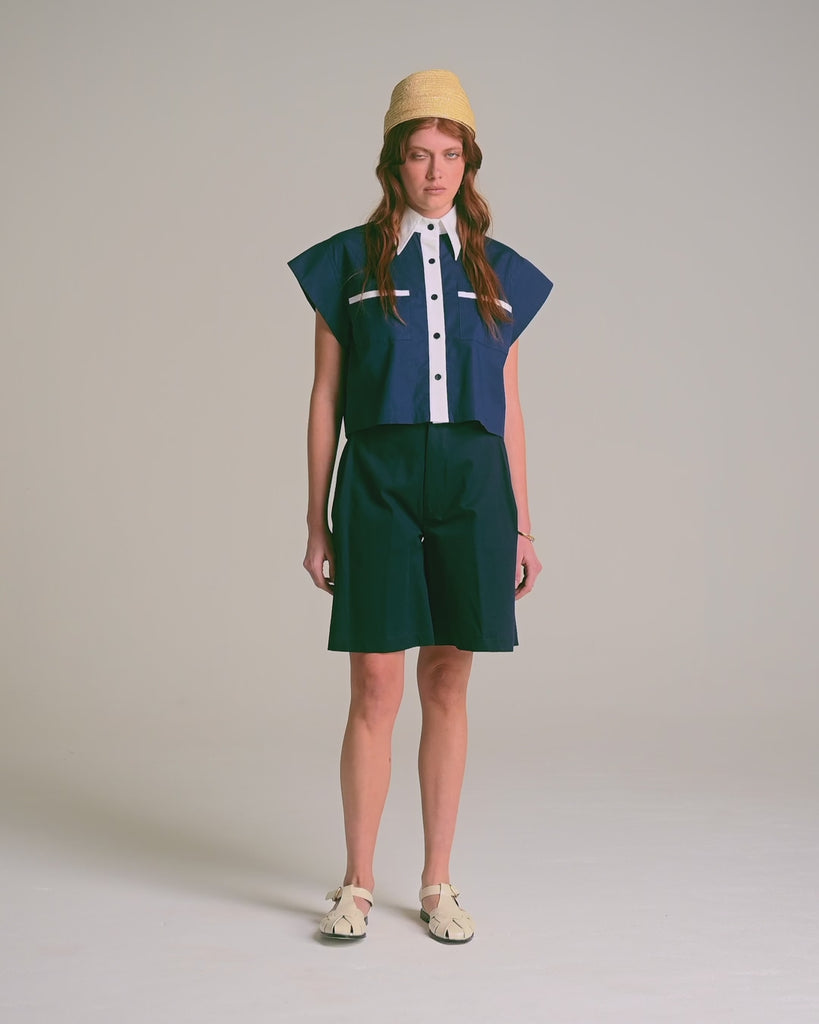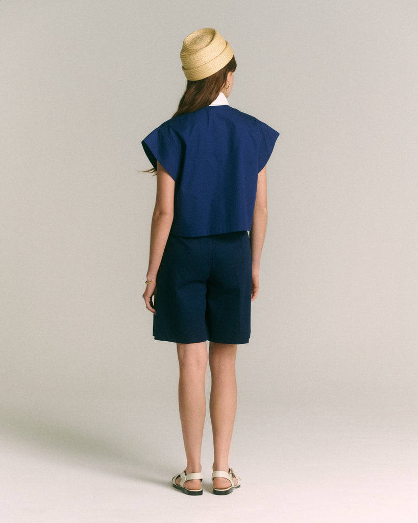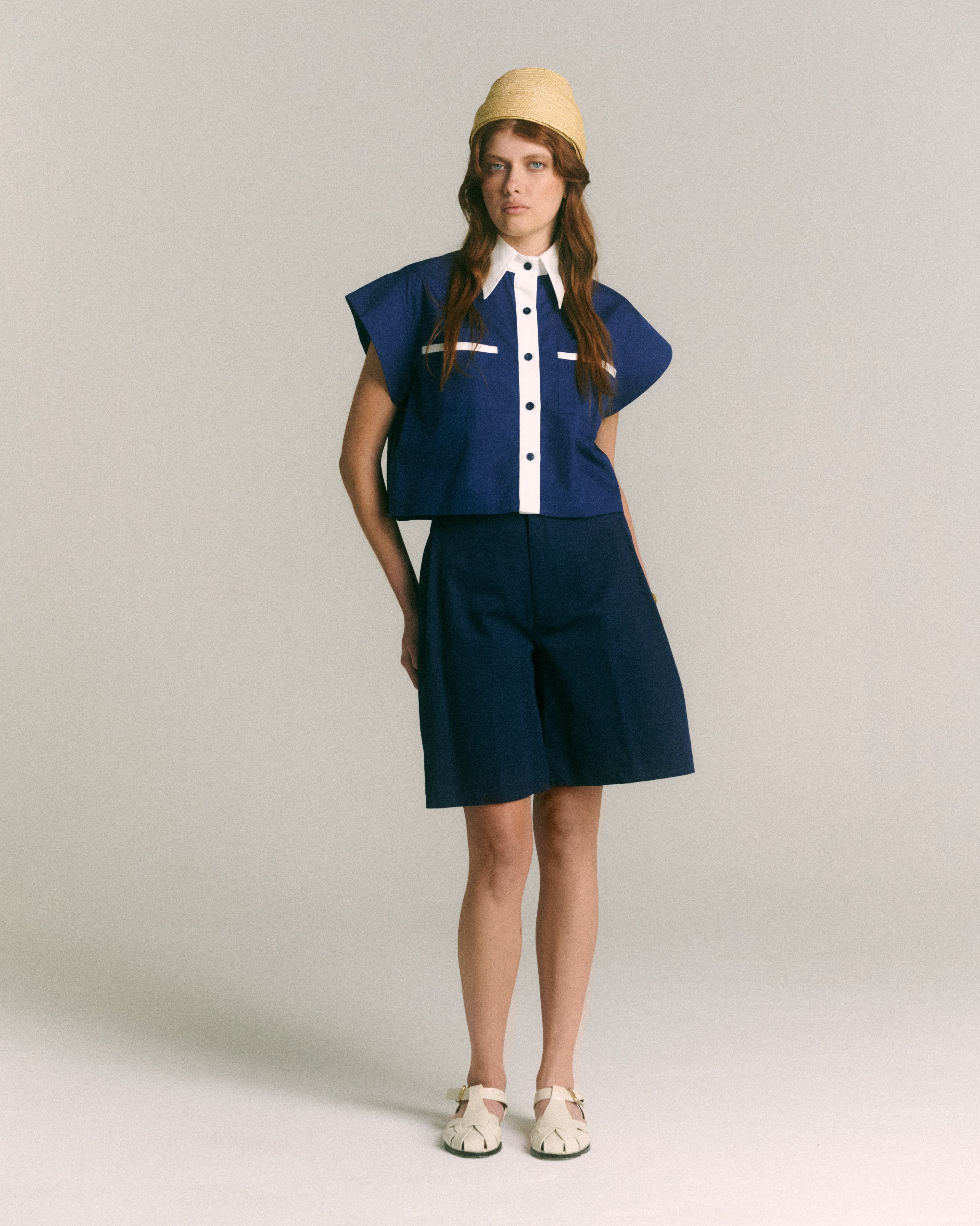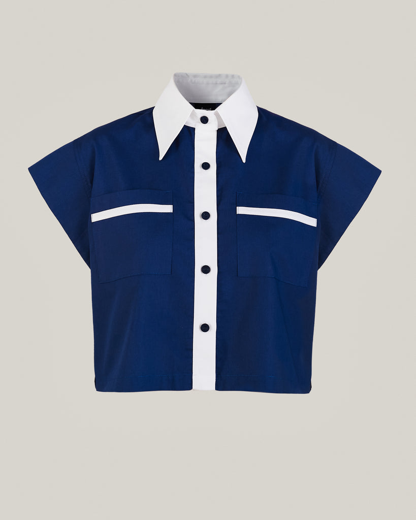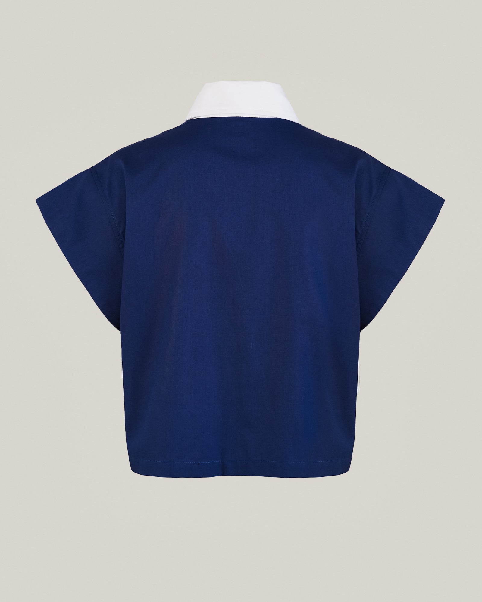 La Blusa Rocío en azul marino es una interpretación moderna del clásico estilo utilitario, combinando estructura y frescura en una prenda ideal para el verano. Confeccionada en 100% algodón certificado OEKO-TEX, su diseño cuadrado y relajado resalta por los bolsillos frontales con vivos blancos en contraste y un cuello italiano en popelina blanca que aporta luminosidad. Los botones a la vista completan su estética contemporánea. Perfecta para quienes buscan una blusa con carácter, cómoda y versátil, para usar tanto con jeans como con prendas más sastreras.