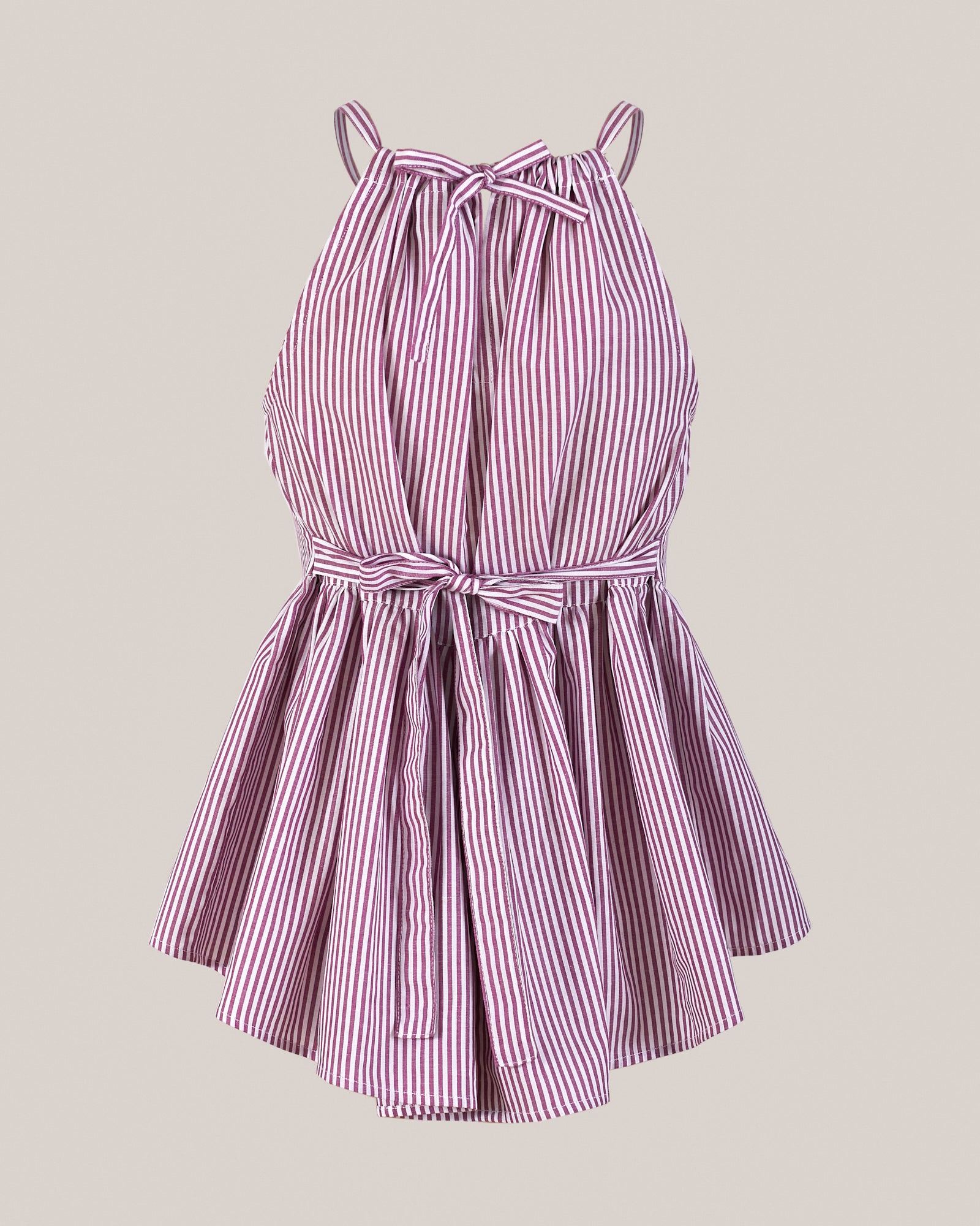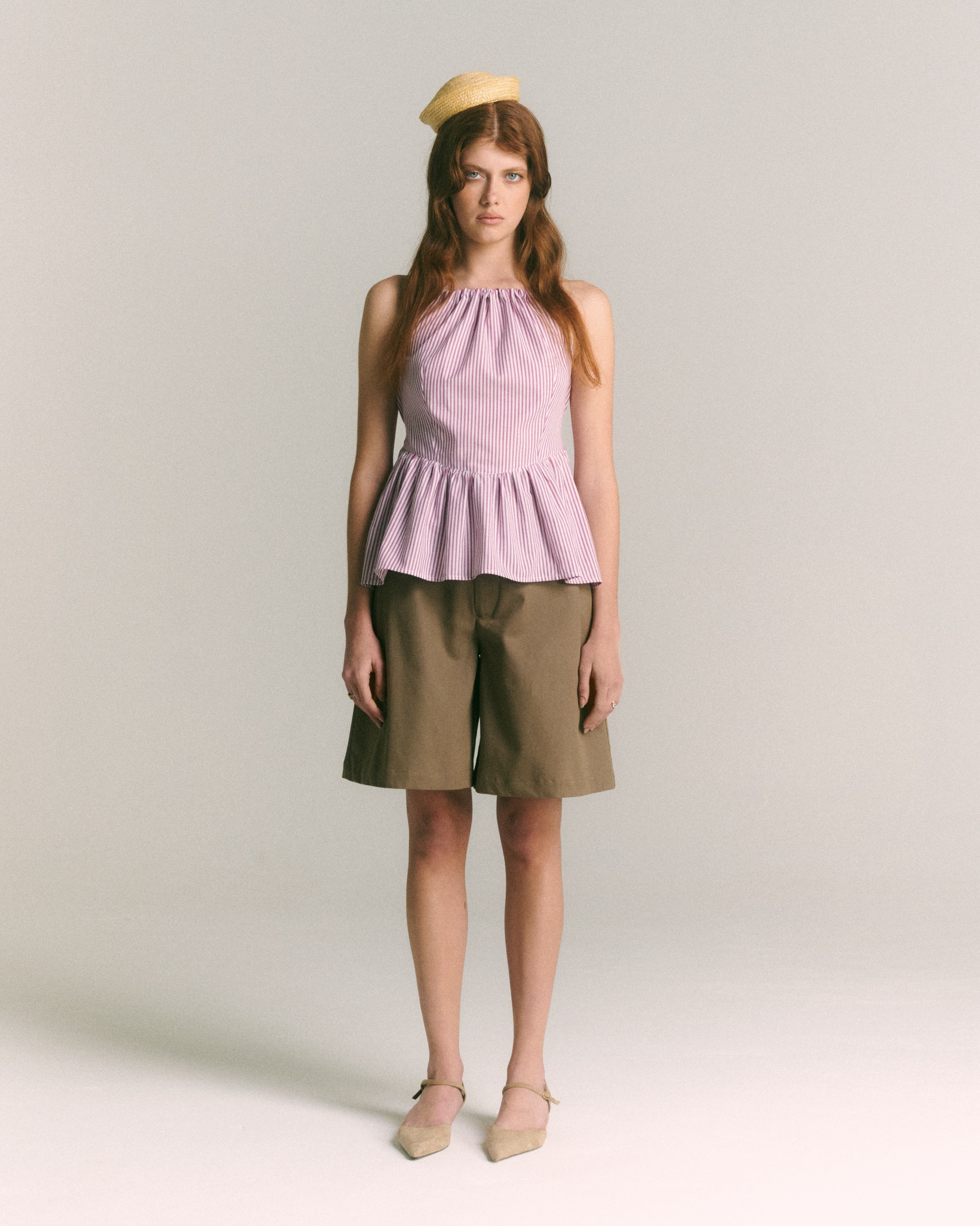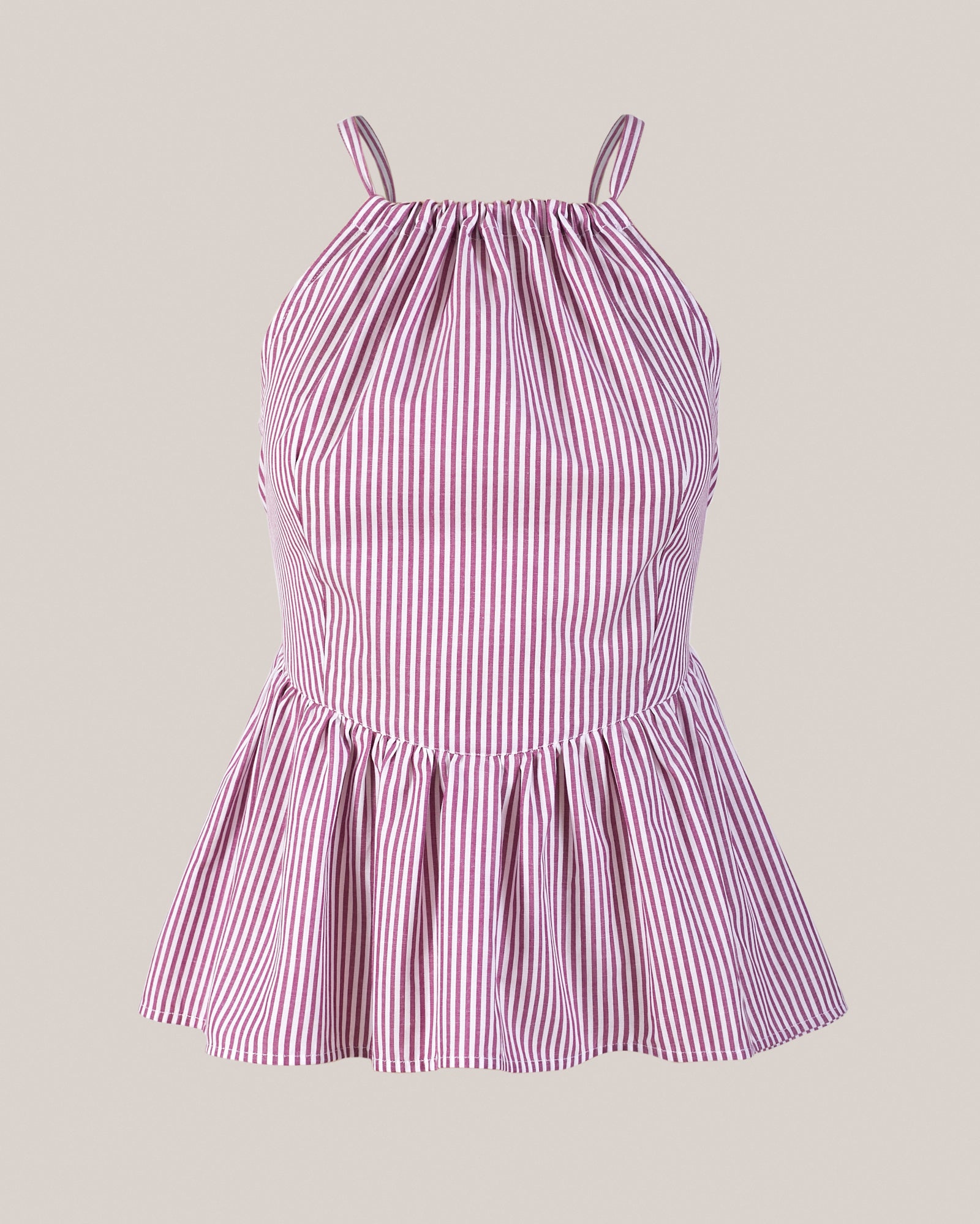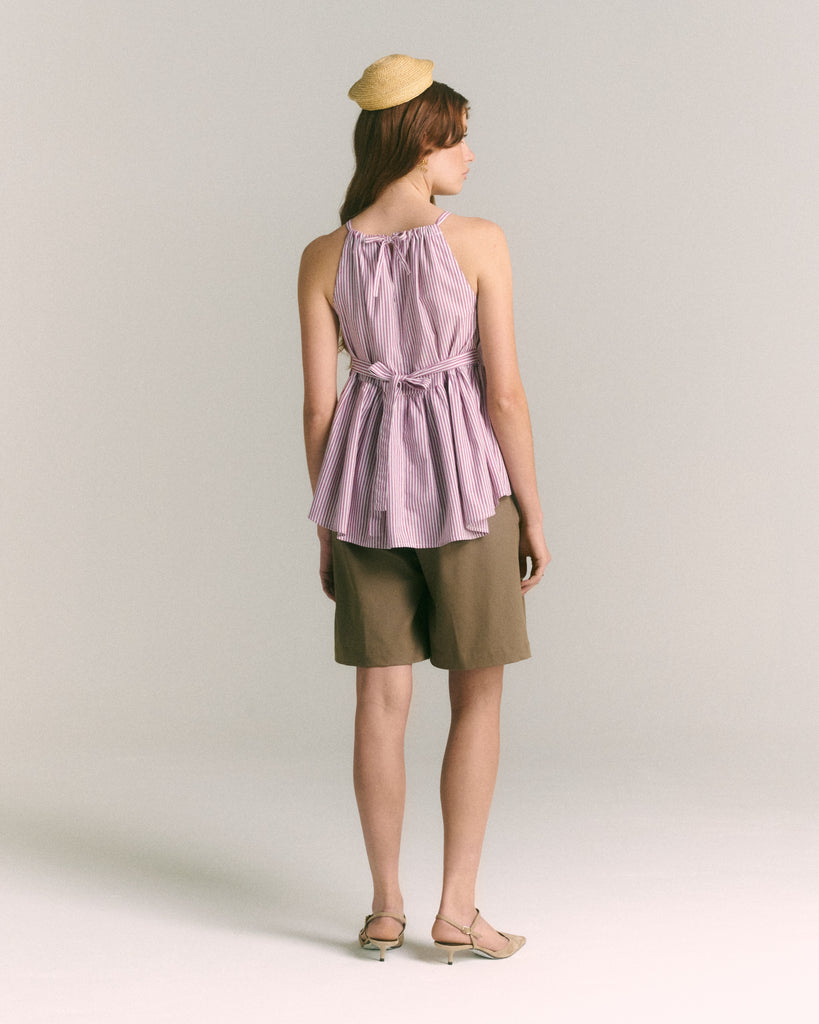 El Top Helena en versión listada burdeo destaca por su silueta femenina y su aire veraniego. Con un diseño sin mangas y escote recogido tipo halter, esta prenda equilibra ligereza y estructura. Su pretina ajustada realza la figura, mientras que el pequeño volante inferior le da un movimiento delicado y favorecedor. Se anuda en la espalda con dos lazos del mismo tejido, permitiendo un calce personalizado. Ideal para días cálidos, combina perfecto con pantalones, faldas o shorts de tiro alto.