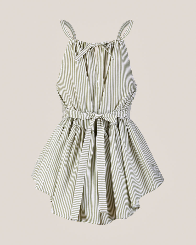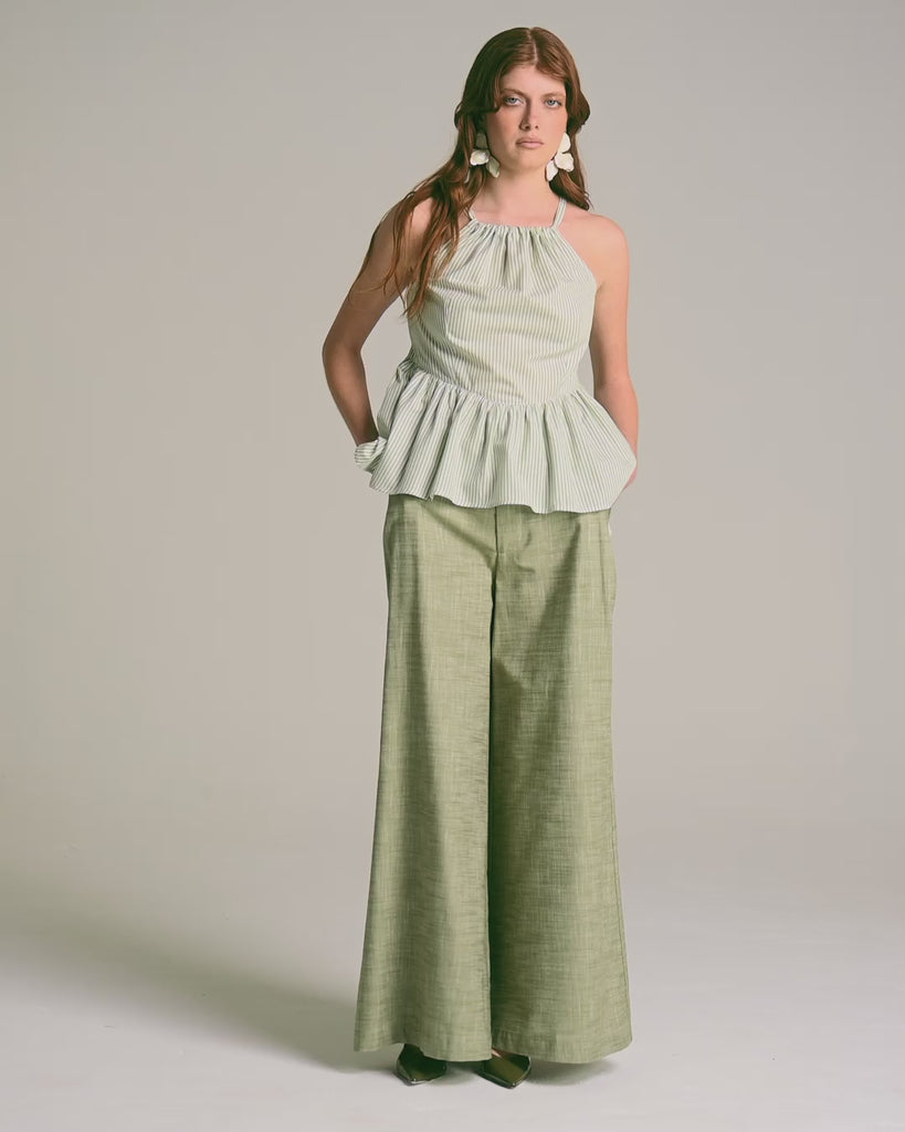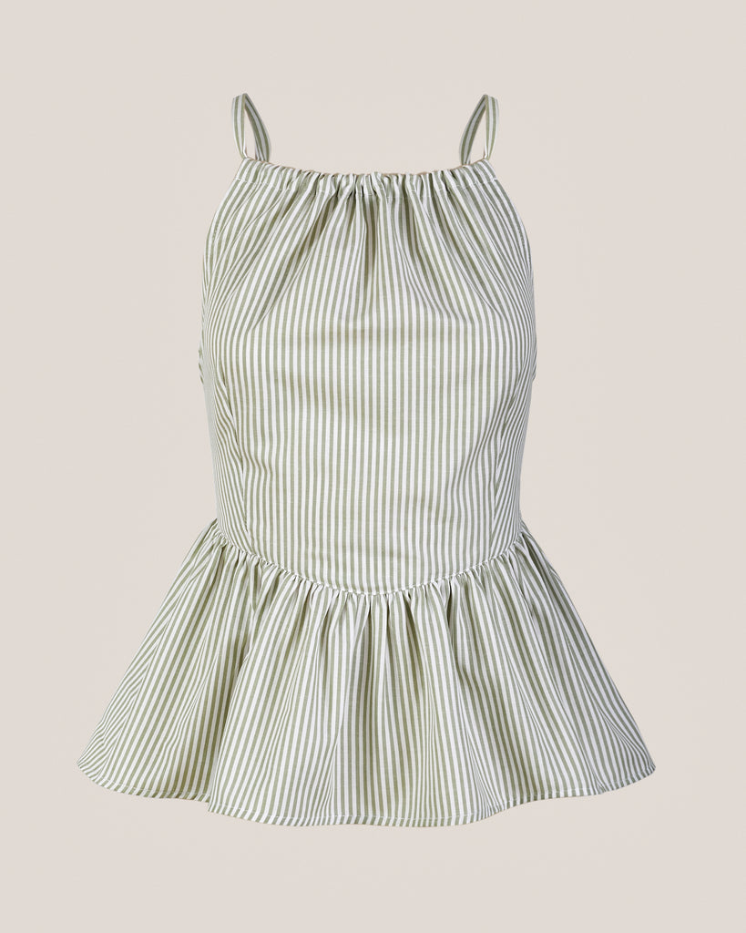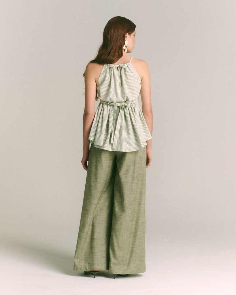 Ligero, femenino y versátil, el Top Helena es una prenda ideal para los días cálidos. Su silueta destaca por el escote tipo halter con sutil recogido en el delantero, delgados tirantes y una pretina amplia que enmarca la cintura y da paso a un peplum con movimiento. La espalda se ajusta mediante un lazo, lo que permite personalizar el calce con comodidad y elegancia. El diseño listado en tonos salvia y blanco aporta frescura y un aire natural a tu look. Perfecto para combinar con prendas neutras o para armar conjuntos coordinados con otros ítems de la colección.