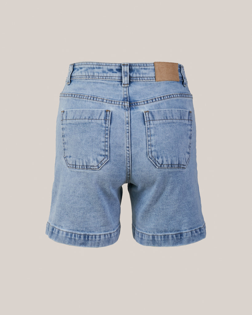 El Short Julieta en denim de algodón celeste es una prenda fresca y versátil que aporta un aire relajado a los looks de verano. Su silueta de tiro alto y pierna recta se adapta cómodamente al cuerpo, mientras que los bolsillos frontales de parche le dan un toque utilitario sutil. Con basta doblada y textura levemente desgastada, es ideal para combinar con tops ligeros, camisas o blusas románticas.