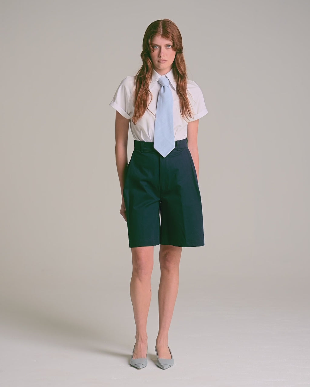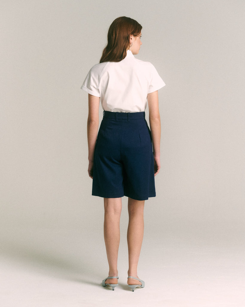 La Bermuda Sofía Azul reinterpreta el clásico pantalón sastre en una versión moderna y versátil, ideal para los días cálidos. Con un calce estructurado pero cómodo, esta prenda destaca por su silueta ligeramente acampanada, pretina con pasadores y bolsillos laterales funcionales. Con un largo que llega justo a la altura de la rodilla y confeccionada en algodón certificado, es una opción fresca y elegante para looks urbanos o más pulidos.