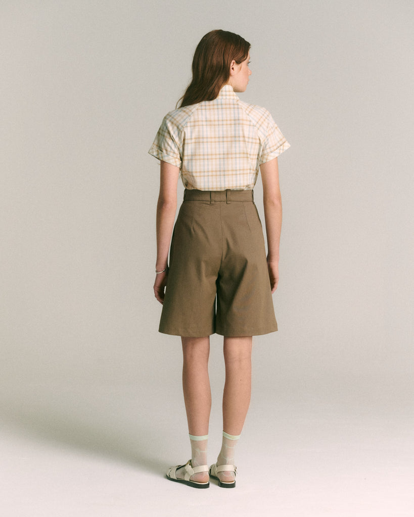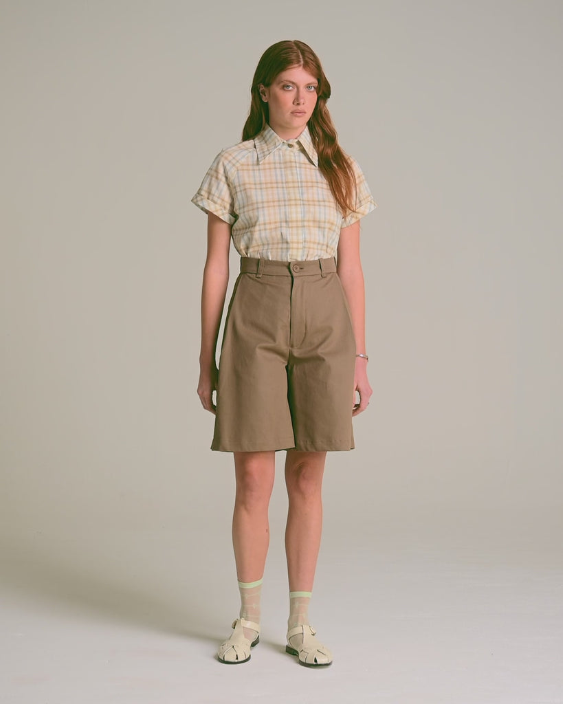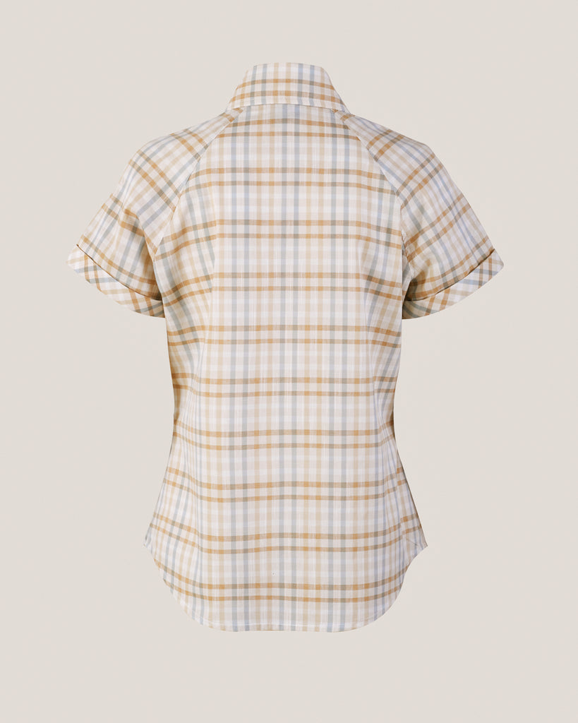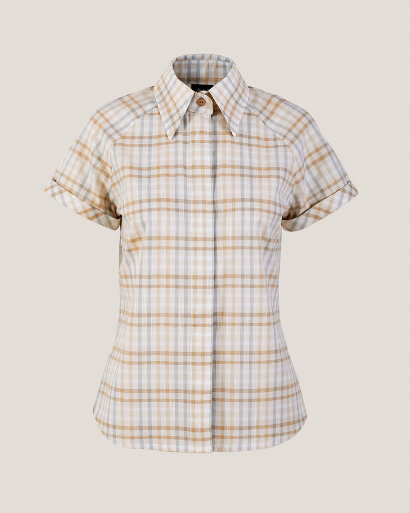 La Blusa Raquel reinterpreta el clásico cuadrillé con una paleta suave y atemporal, perfecta para los días de calor. Confeccionada en 100% algodón certificado OEKO-TEX, su diseño entallado realza la silueta sin perder comodidad. El cuello amplio tipo italiano y las mangas cortas raglán con terminación vuelta aportan estructura y un aire nostálgico, mientras que su cierre frontal oculto asegura una terminación limpia y elegante. Una blusa versátil que combina sencillez y carácter, ideal para looks casuales o más pulidos.