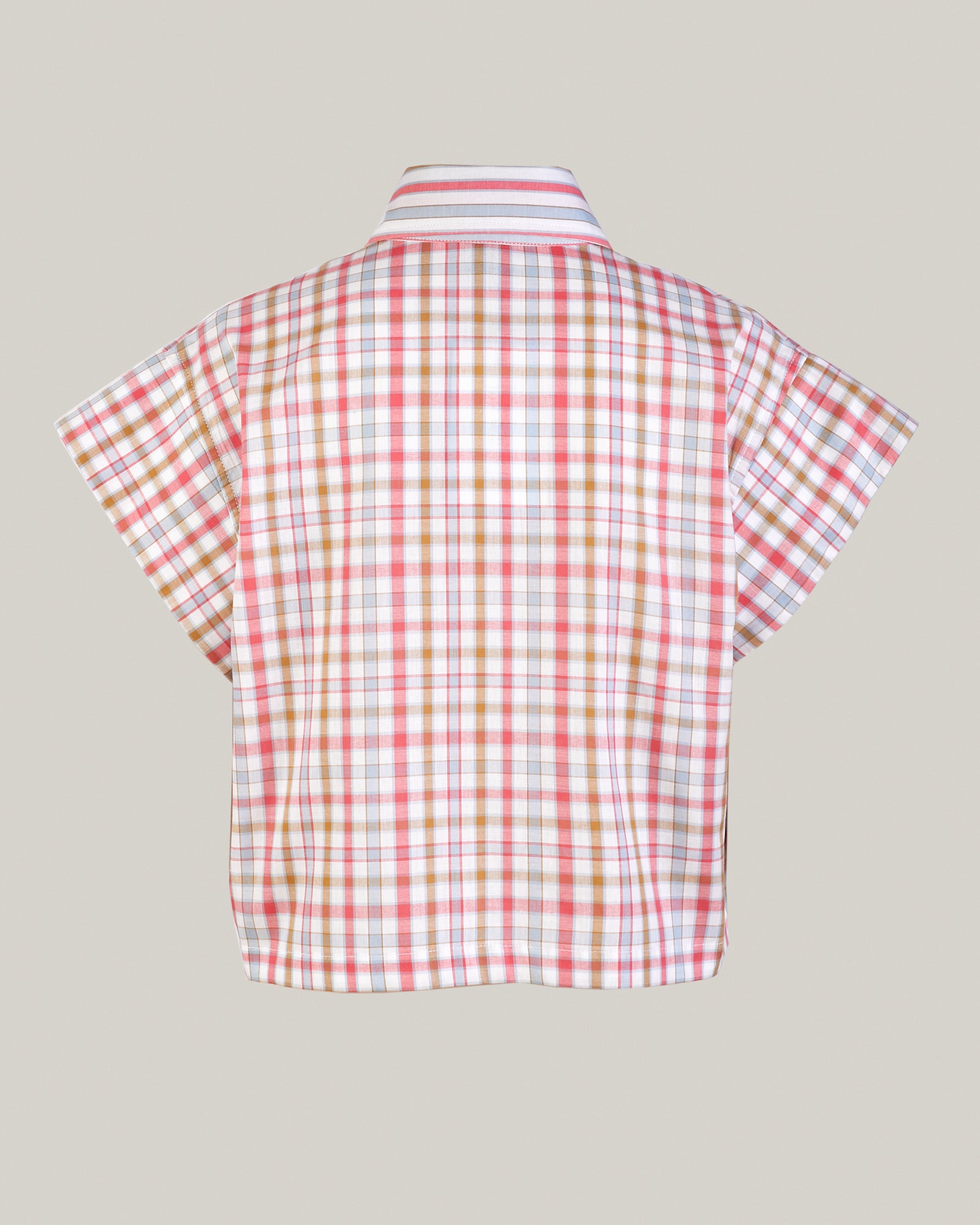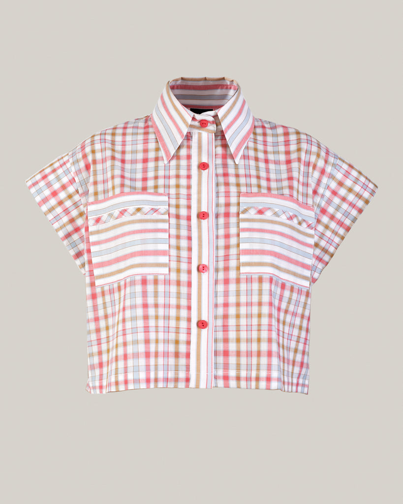 La Blusa Rocío Cuadrillé Rojo reinterpreta el clásico estilo campero con una mirada fresca y femenina. Confeccionada en 100% algodón certificado OEKO-TEX, su silueta amplia y corta ofrece una alternativa relajada para los días más calurosos. El contraste de cuadros y rayas, junto a los bolsillos frontales decorados con vivo en zigzag, aportan carácter y un toque lúdico. Su cuello italiano estructurado y los botones rojos a la vista refuerzan la estética nostálgica con un aire moderno.