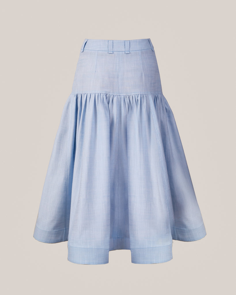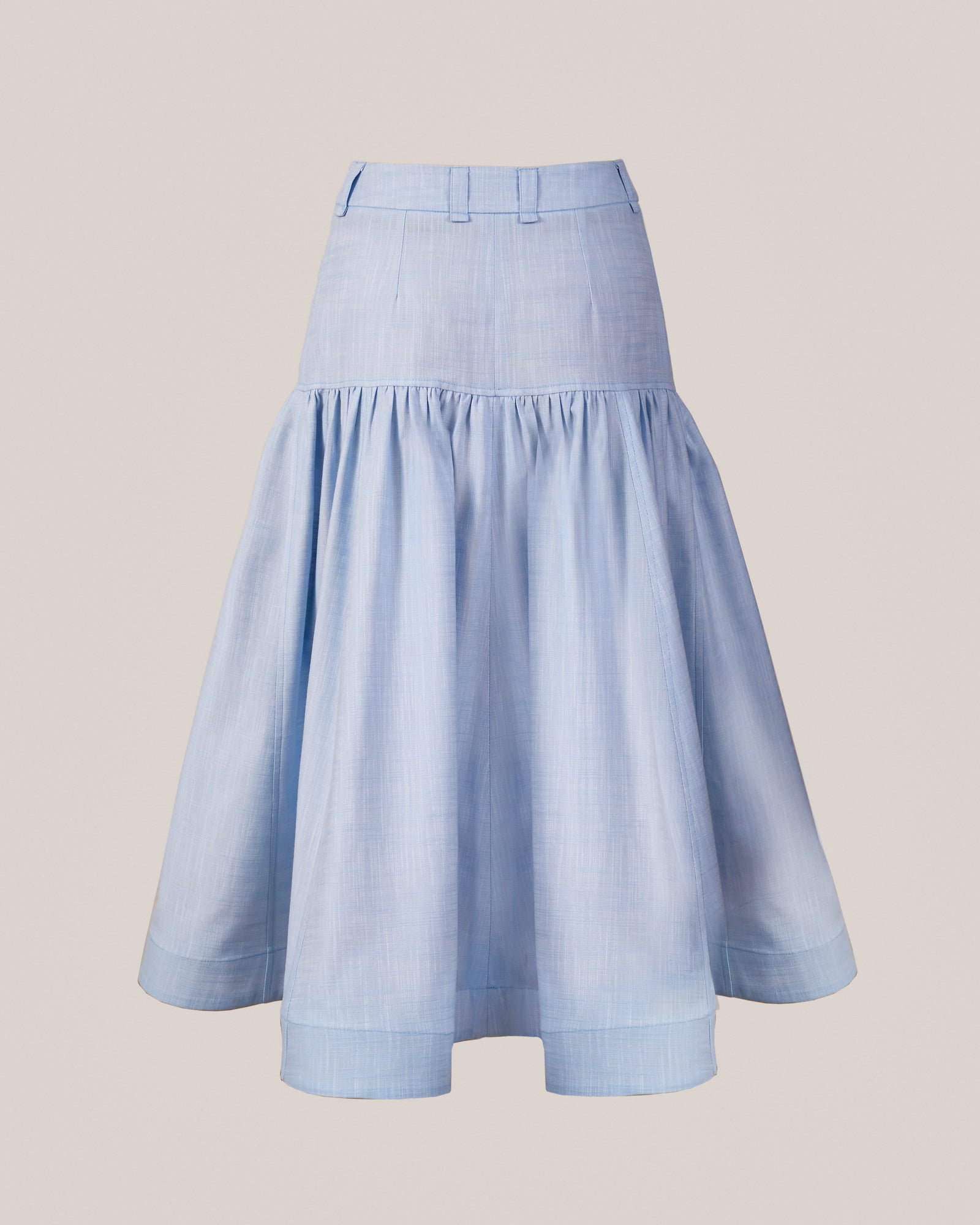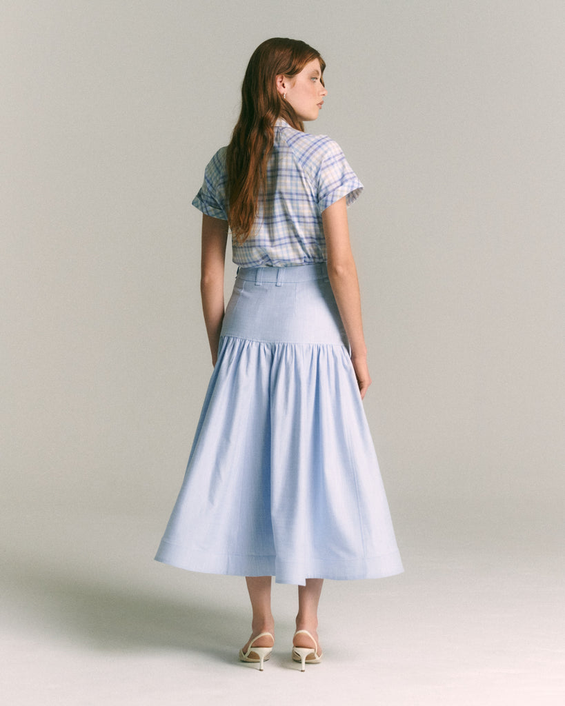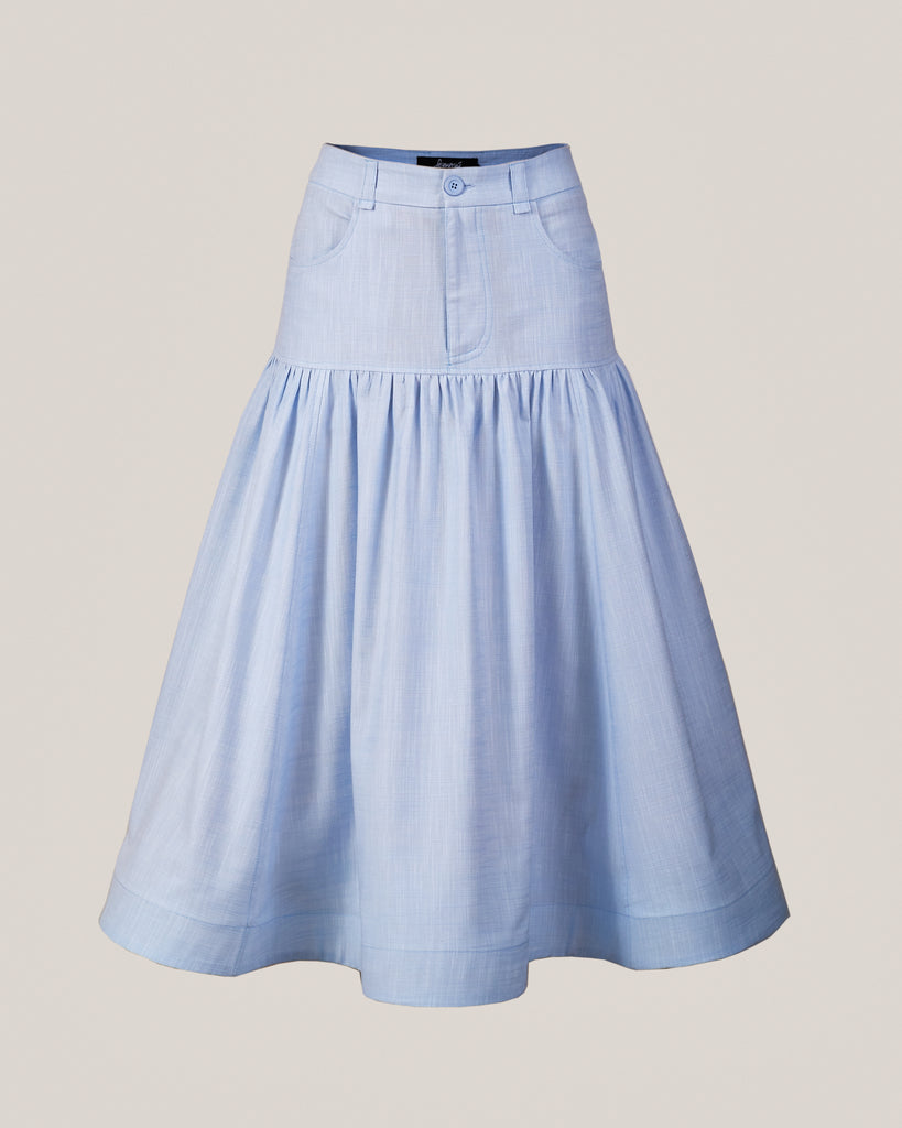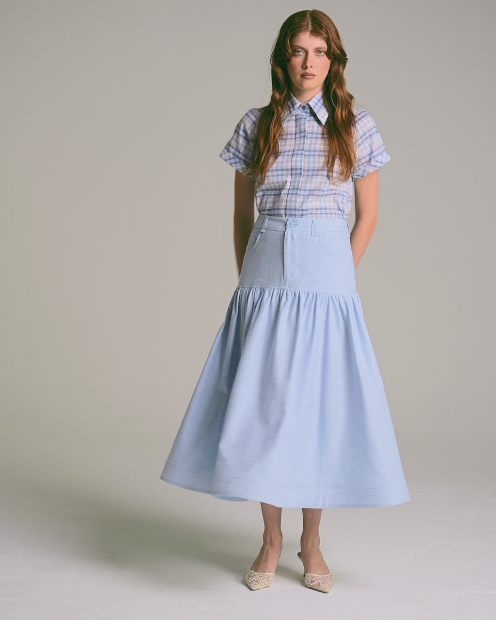 La Falda Luisa en su versión celeste es una propuesta fresca y sofisticada para los días de calor. Confeccionada en 100% algodón certificado OEKO-TEX, su diseño estructurado destaca por una pretina alta con bolsillos delanteros y una falda amplia con vuelo que incorpora una cinta de horse hair en el ruedo para otorgar mayor cuerpo y movimiento. Perfecta para combinar con tops ajustados o blusas románticas.