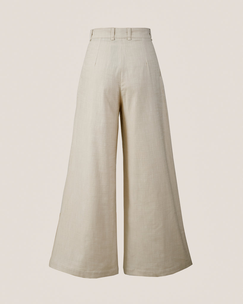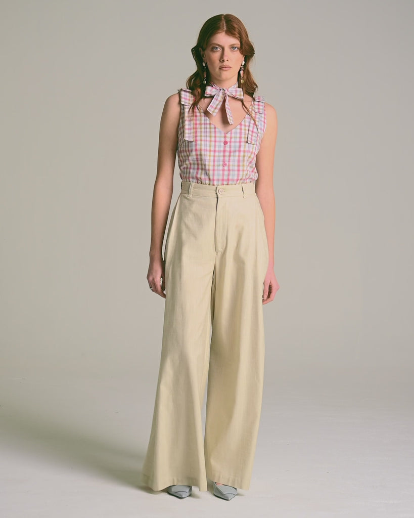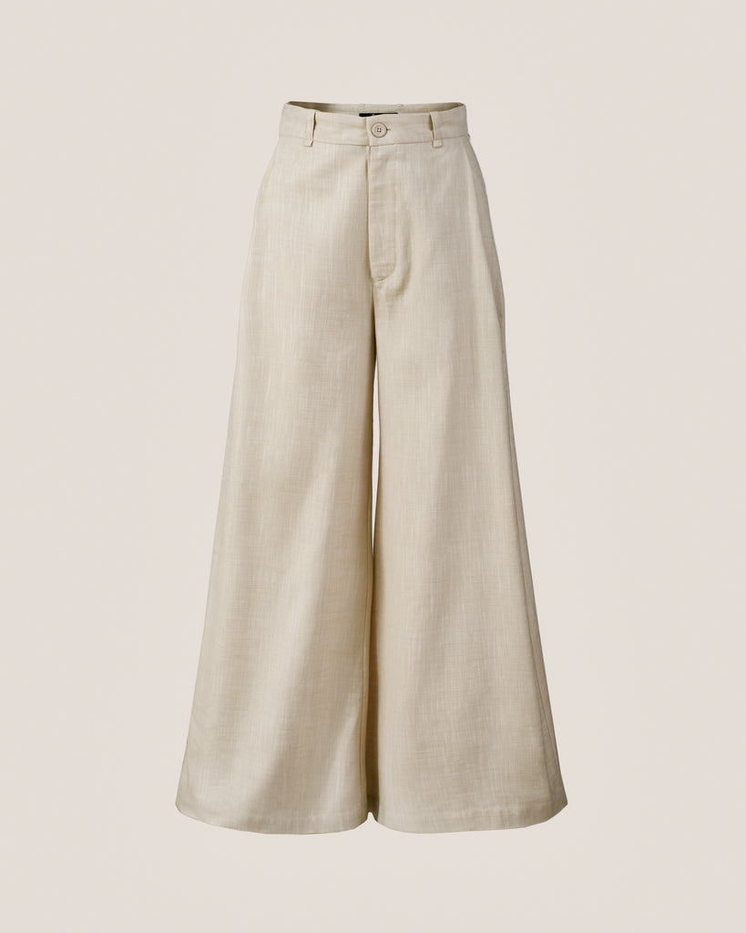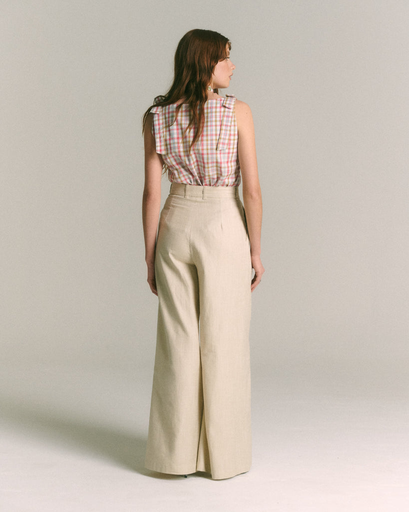 El pantalón Matilde Arena se define por su elegancia sobria y su silueta amplia tipo palazzo, que otorga movimiento y sofisticación a cualquier look. Confeccionado en algodón 100% certificado OEKO-TEX, su tela de aspecto levemente texturizado y tono arena claro aporta frescura y versatilidad. Destaca por su calce a la cintura, pretina con pasadores, tablas frontales a la altura de los bolsillos que aportan volumen controlado, y cierre frontal con botón al tono. Una pieza atemporal que puedes combinar con blusas livianas o tops ajustados para equilibrar proporciones.