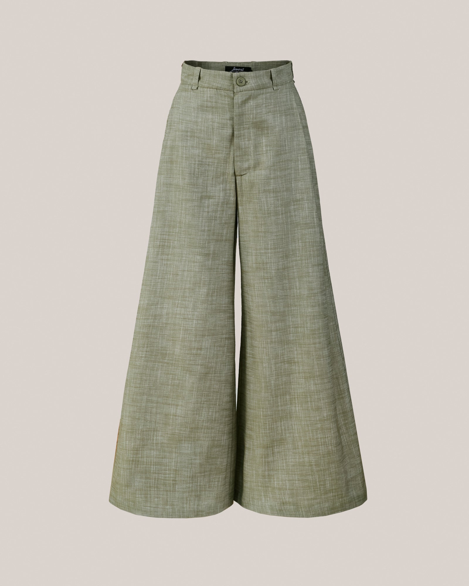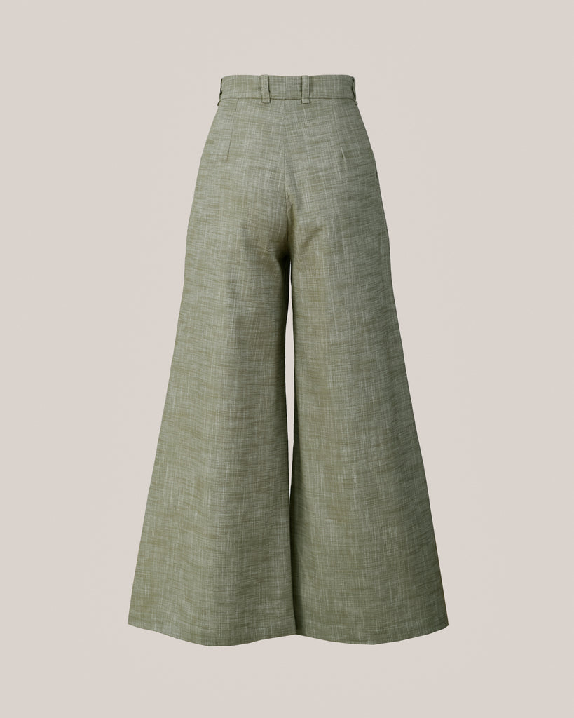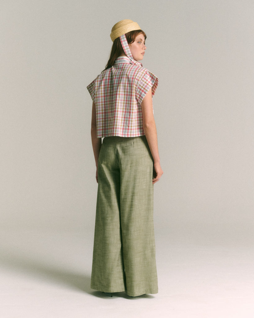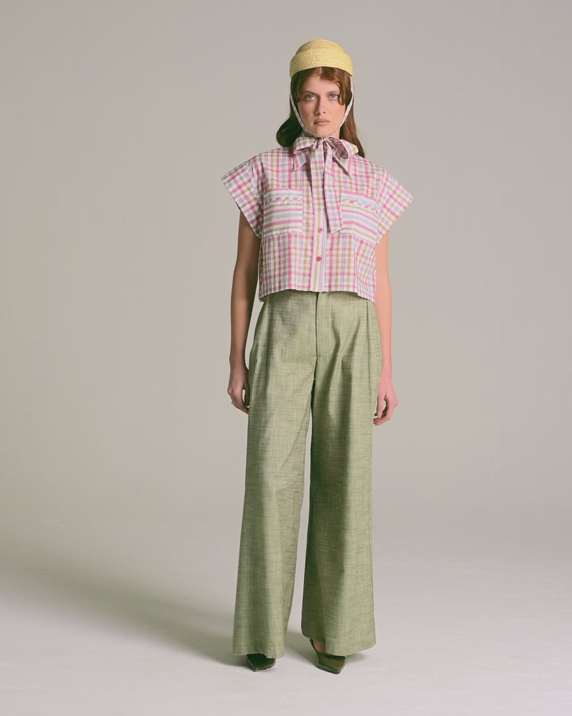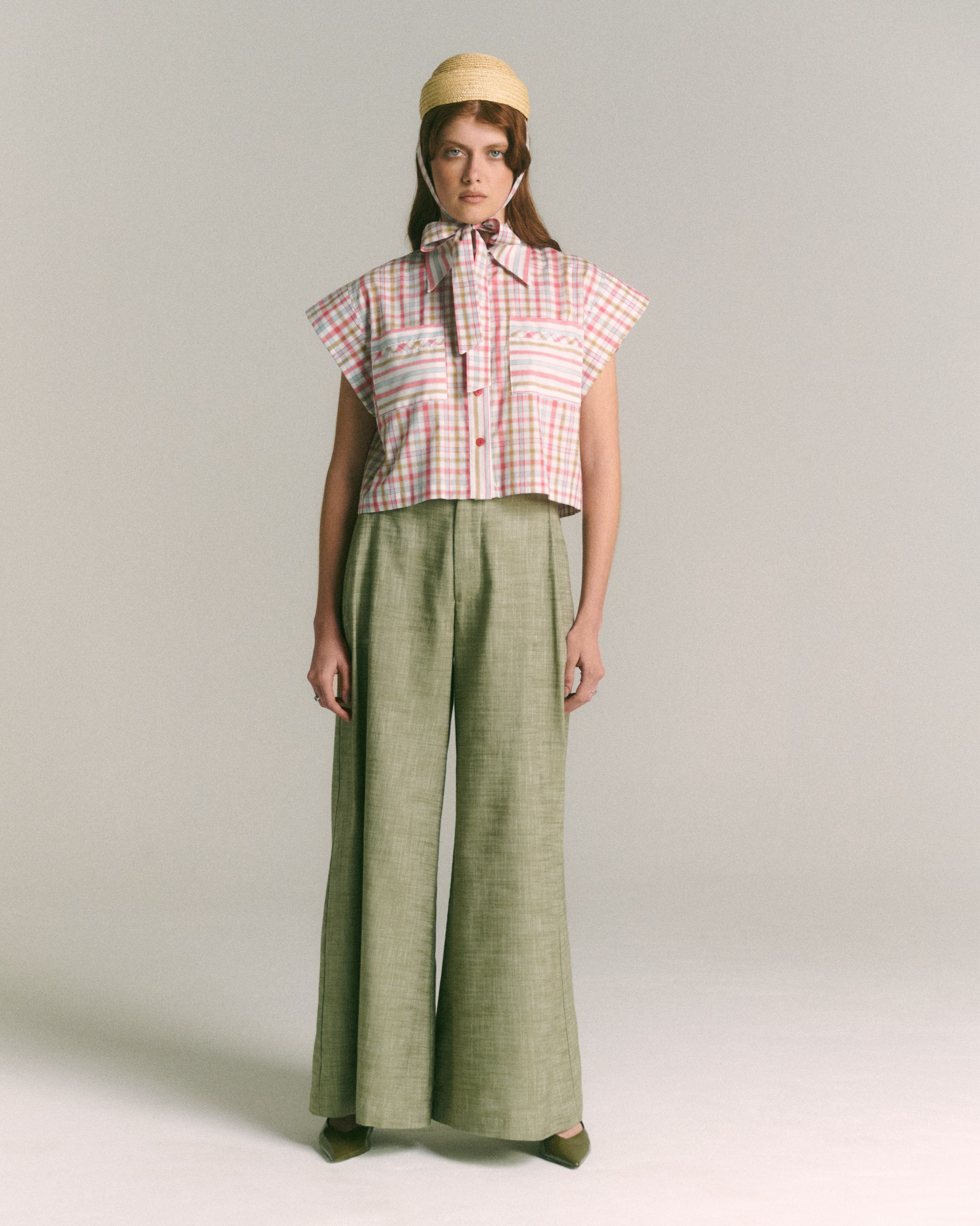 El Pantalón Matilde vuelve esta temporada en un tono Olivo que evoca naturaleza, frescura y sofisticación. Su silueta palazzo estiliza y alarga visualmente las piernas, mientras que las pequeñas tablas a la altura de los bolsillos aportan estructura sin perder movimiento. Está confeccionado en algodón 100% certificado OEKO-TEX, con una textura suave y liviana ideal para los días más cálidos.
