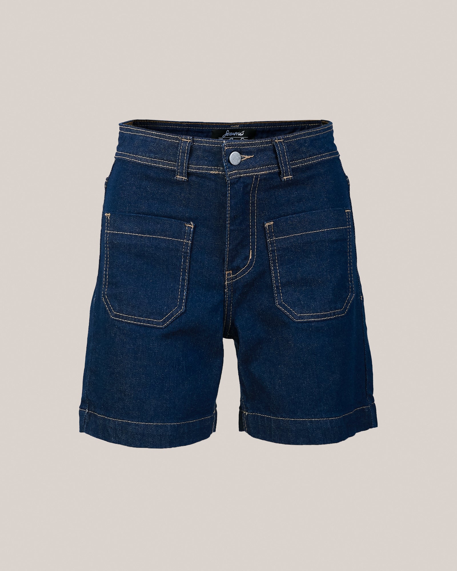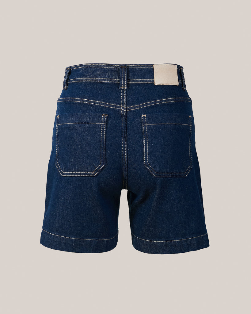 El short Julieta en su versión de denim azul profundo es un básico atemporal que se adapta a múltiples ocasiones. Su silueta de calce relajado, largo a medio muslo y bolsillos amplios en el delantero le dan un aire utilitario y moderno. El tono índigo clásico contrasta con las costuras color caramelo, resaltando su construcción y detalles. Perfecto para acompañar blusas ligeras o tops de algodón en los días más cálidos.