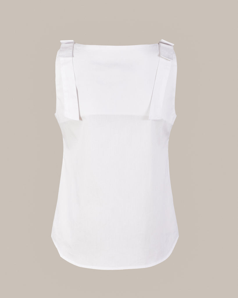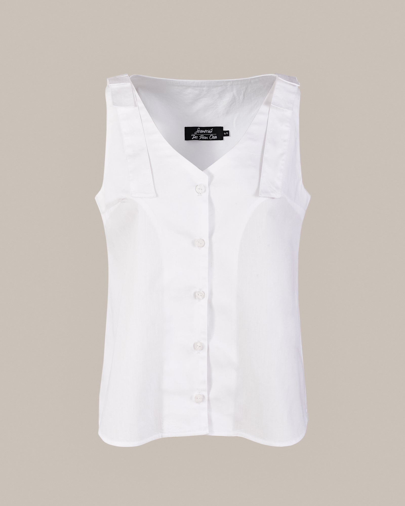 El Top Diana en su versión blanca es una prenda fresca y atemporal, pensada para acompañarte en los días más cálidos con un aire elegante y minimalista. Su diseño sin mangas y escote en "V" se equilibra con los tirantes anchos que presentan delicados pliegues estructurados, añadiendo interés visual y un toque distintivo. Confeccionado en algodón blanco certificado OEKO-TEX, este top no solo es suave y respirable, sino también una opción consciente y duradera para tu clóset.