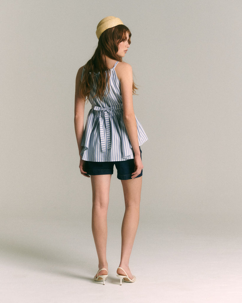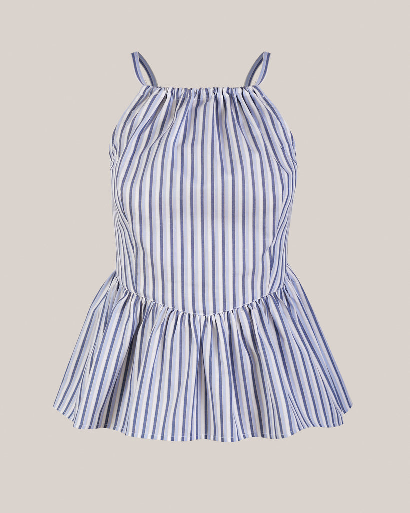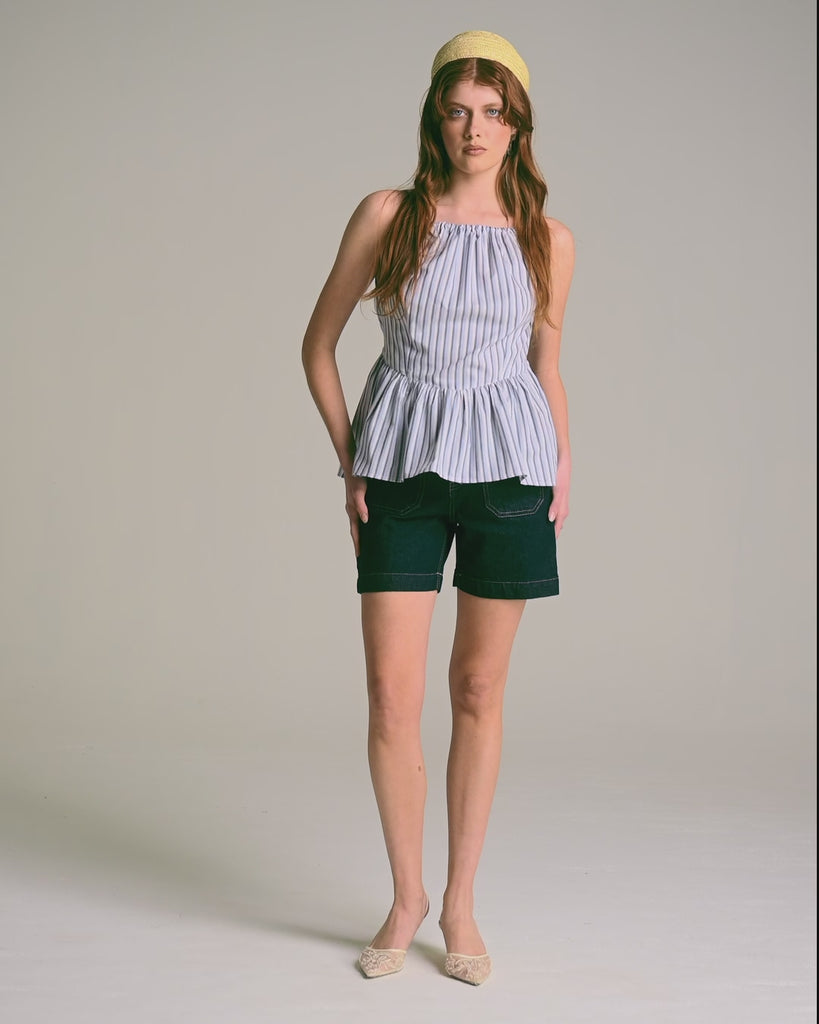 El Top Helena combina frescura y movimiento con una silueta femenina y ligera. Su escote recto fruncido con tirantes delgados enmarca el rostro y los hombros con delicadeza, mientras que el peplum que nace desde la cintura aporta volumen y gracia al conjunto. El lazo en la espalda permite ajustarlo sutilmente, destacando la cintura sin perder comodidad. Ideal para días cálidos, este diseño aporta una dosis de aire romántico y atemporal a tu guardarropa.