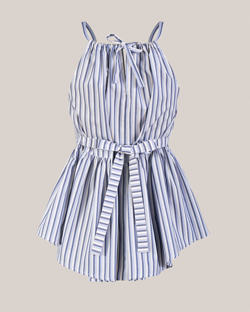 • Confeccionado en algodón listado celeste con rayas azul marino y gris