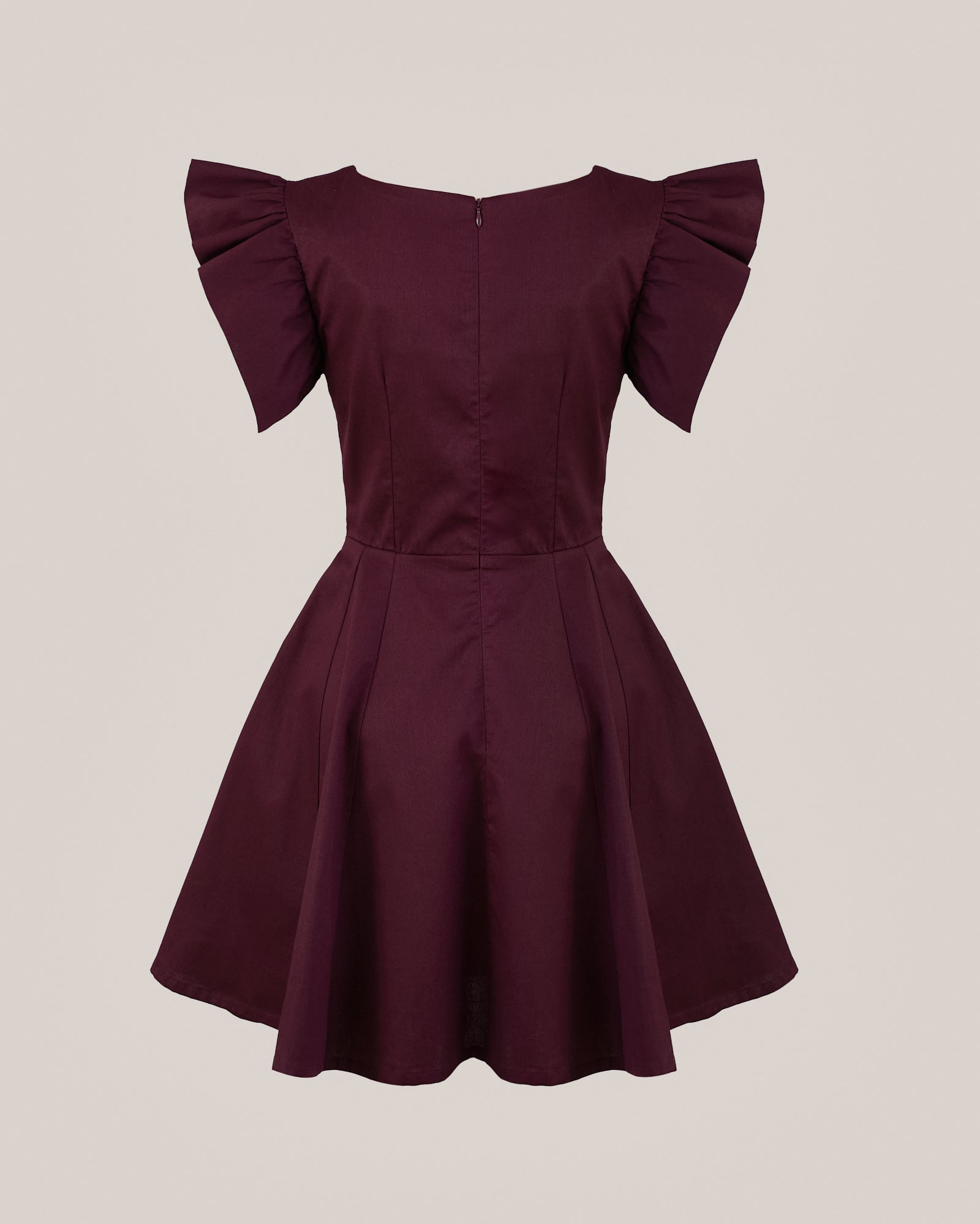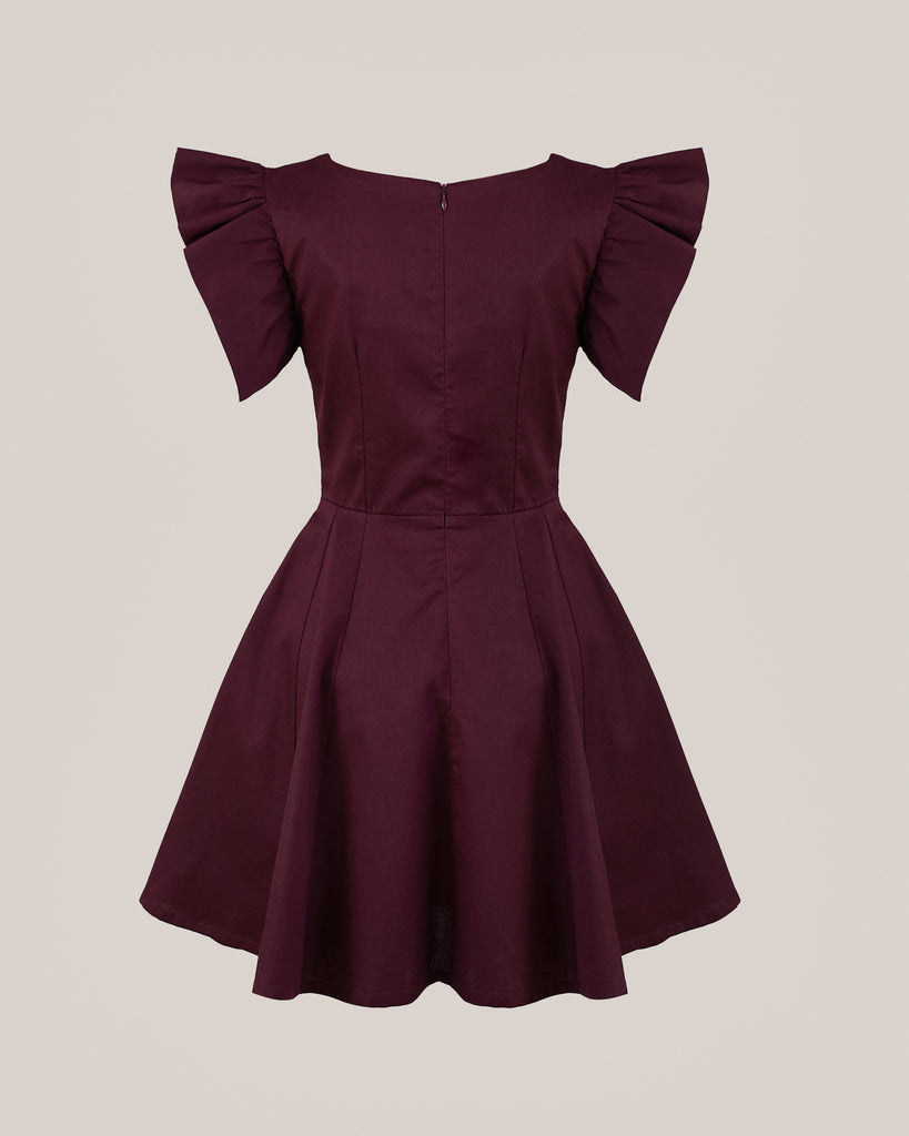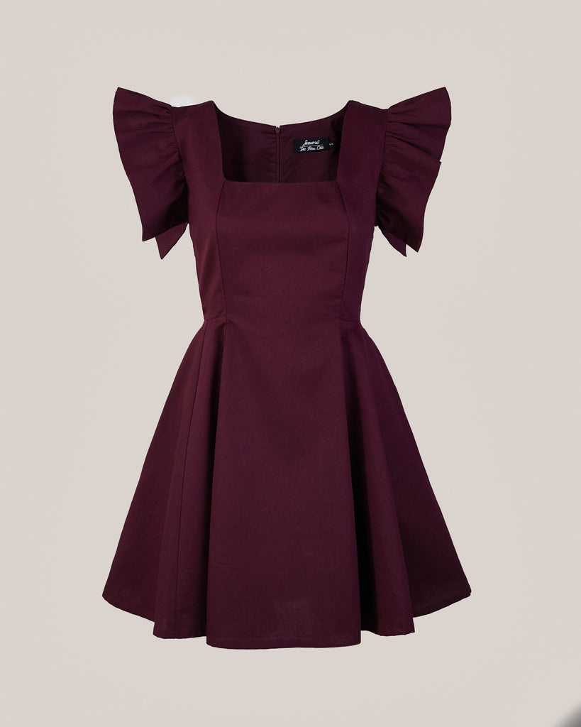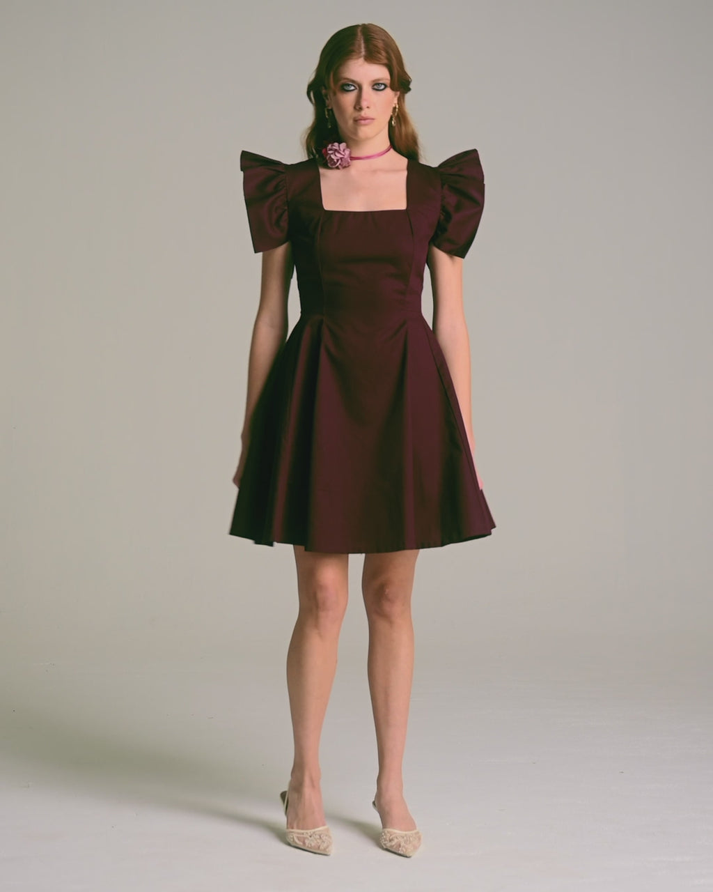 • Vestido corto con escote cuadrado y mangas tipo mariposa.